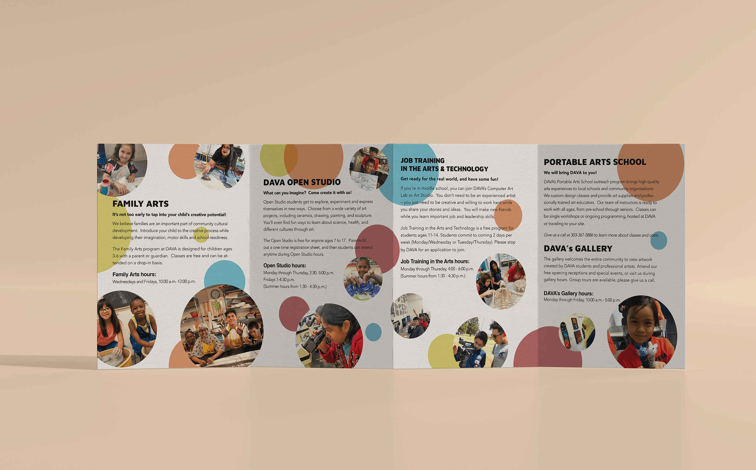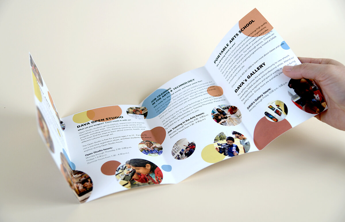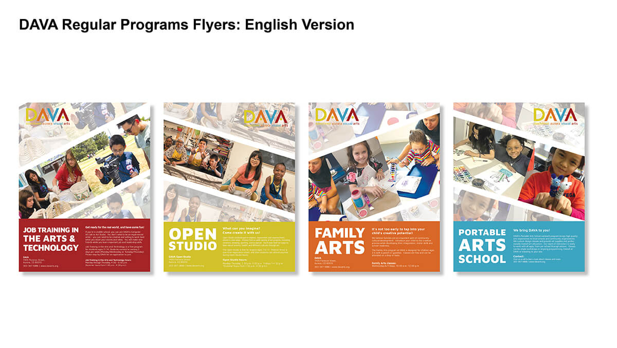 DAVA is a local non-profit arts organization that provides art education programs for urban youth ages ranging from 3 to 17. Due to the company directorial change, they recently realized the importance of marketing. In this project, I worked as an only design intern to present the final deliverables. My responsibility was to design a series of print and digital promotional materials, such as event flyers, social media posters, postcards, programs brochures, and flyers for both English/Spanish languages which will be used in public school systems.