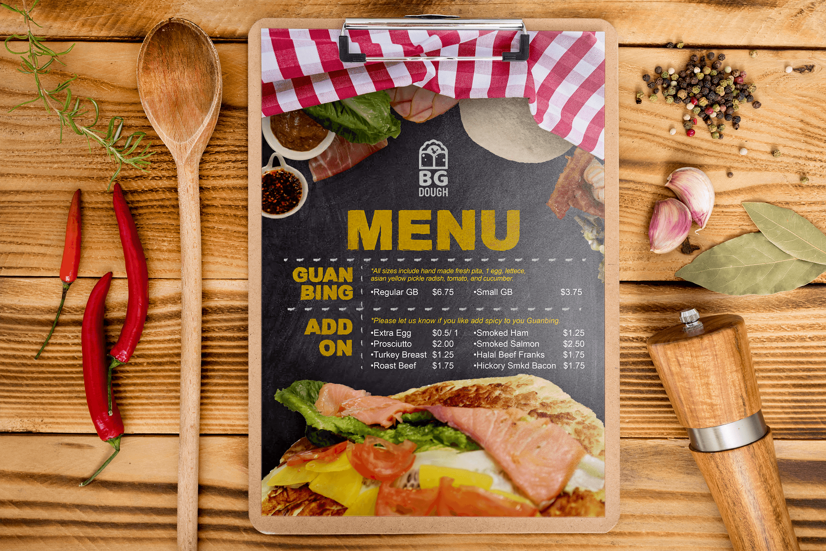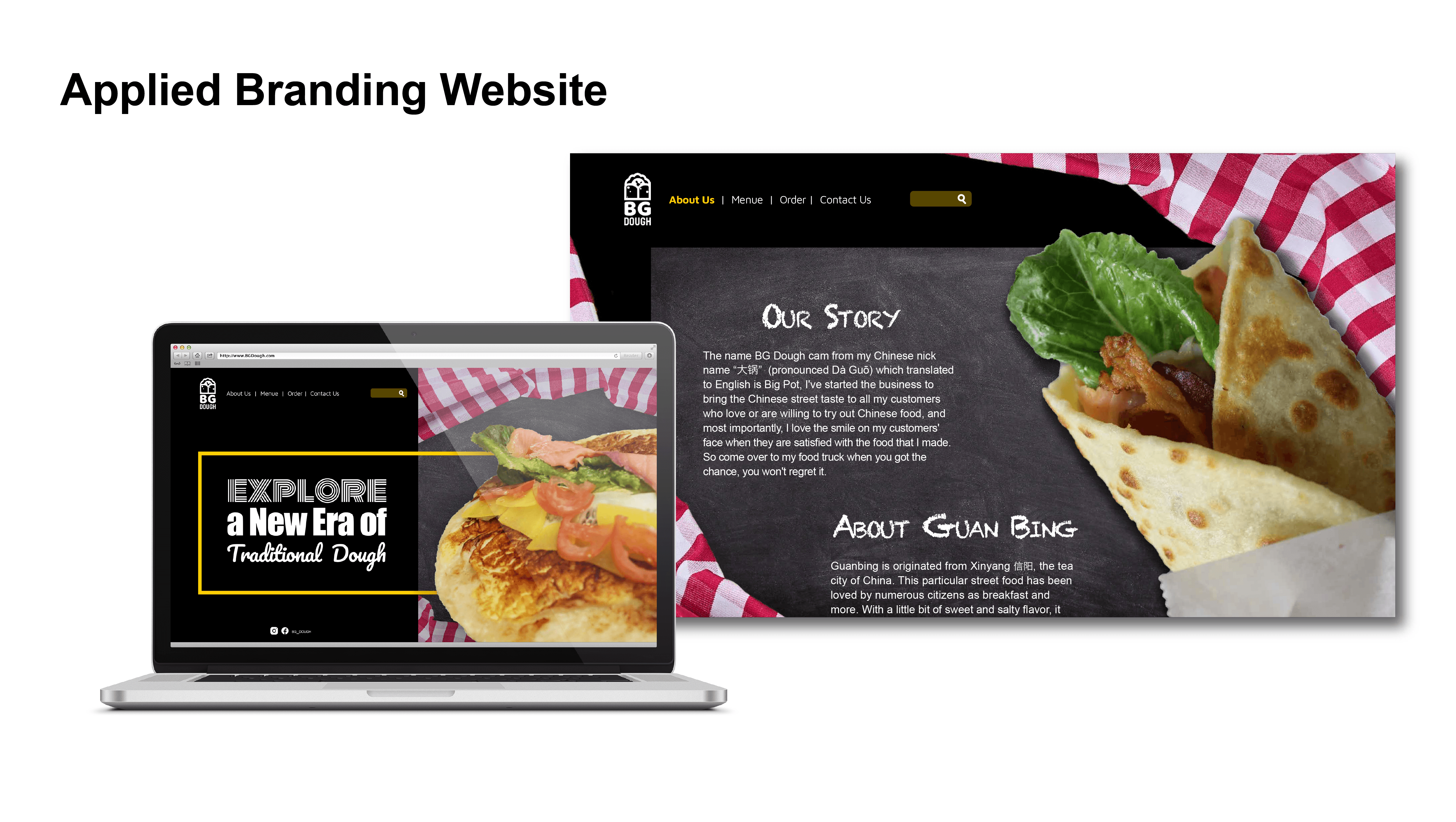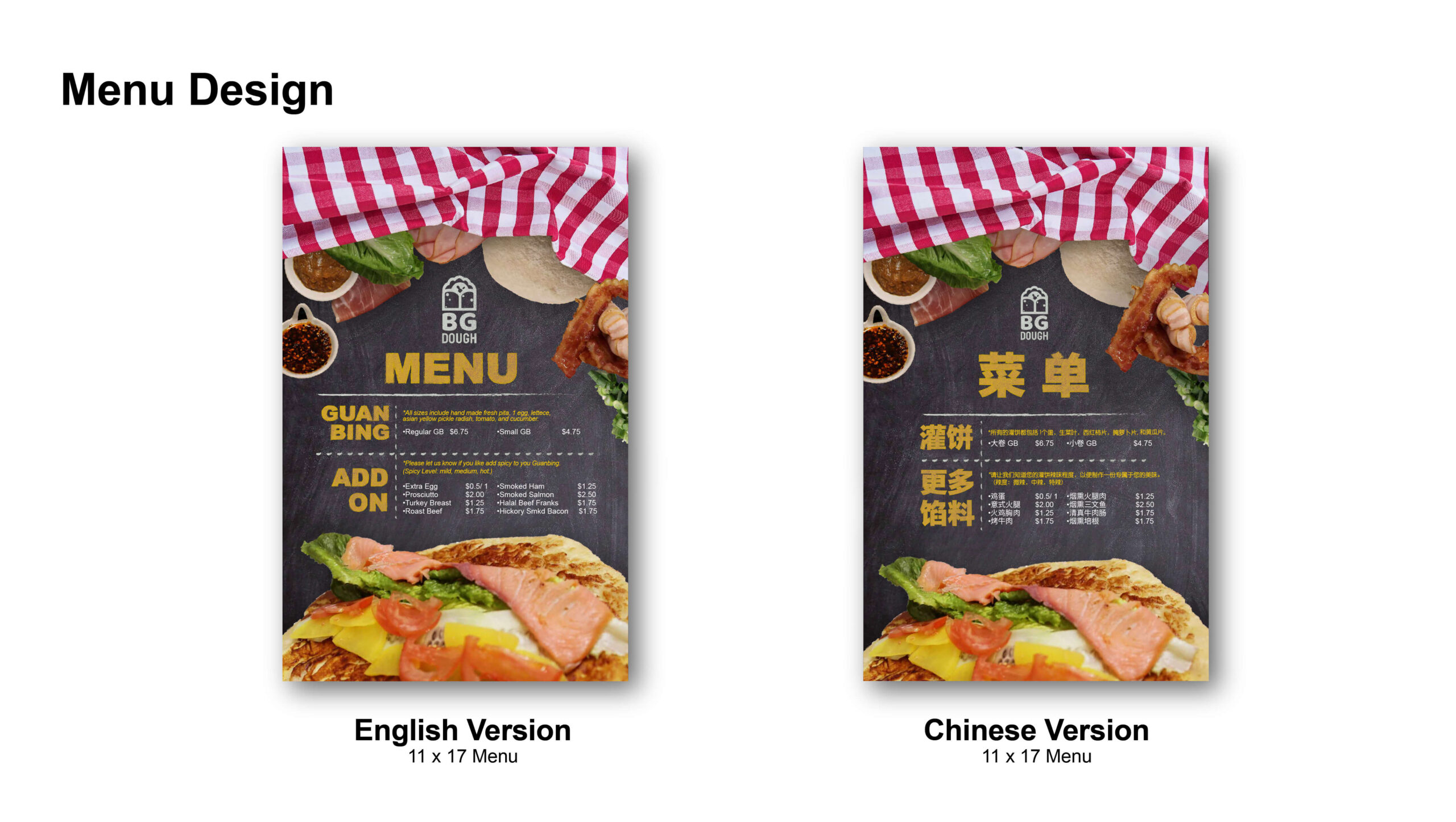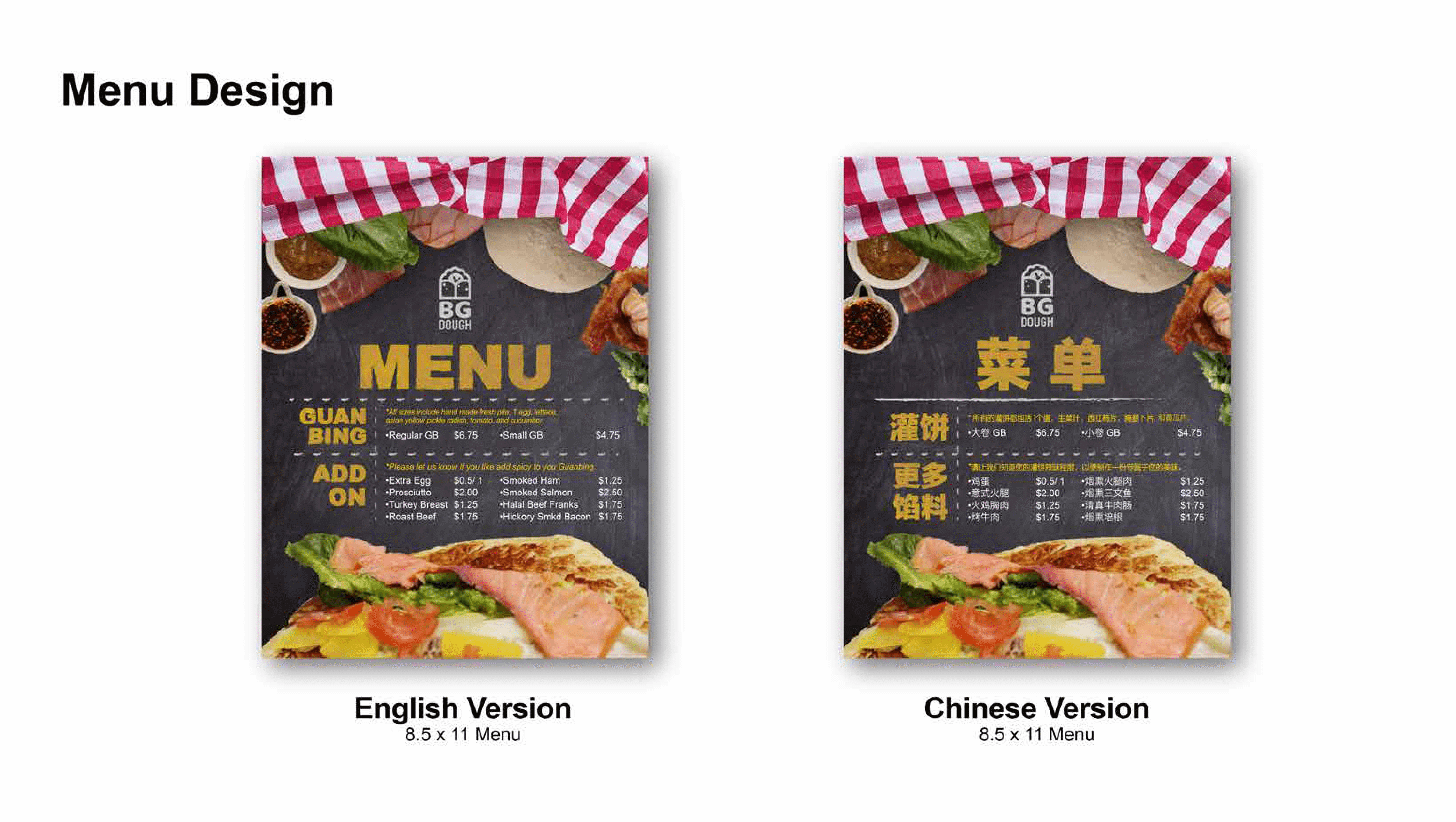 When creating the menus, due to the requirements to produce bilingual (Chinese and English) versions, my point of view was to retain its unique concept of traditional Chinese food and combine it with the idea of fast food. This means that it will not be as luxurious as a “sit-down restaurant”, but it can reflect the combination of both “speed” and “food”. The choice of making the fonts bilingual with relative space and ease of reading, reflect the advantages found in the locations where the food truck would be booked for business. Those locations are mostly within the cities of Denver, Centennial, and Boulder (more specifically, the business is partnering with the bars and supermarkets found within these areas). These locations have an audience who mostly focus on time, efficiency, and are primarily busy with work. Since there are a countless number of competitors, garnering brand attention and highlighting the characteristics of the brand were my goals when creating the menu design.